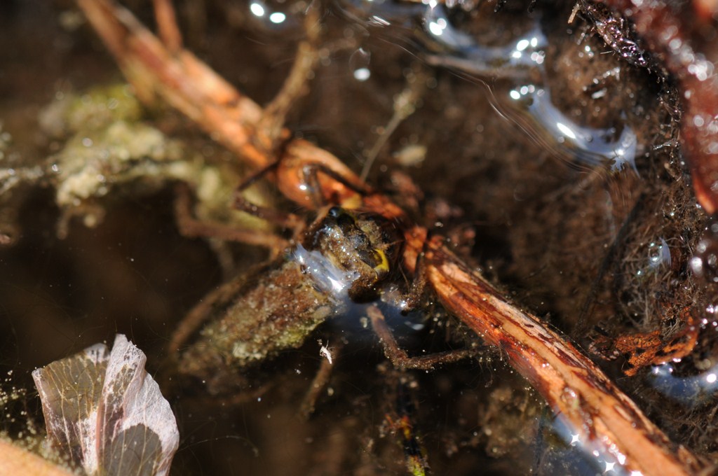 Une fois hors de l'eau la larve se fixe sur une tige et commence sa transformation ici la libellule est déjà sortie de son hôte.