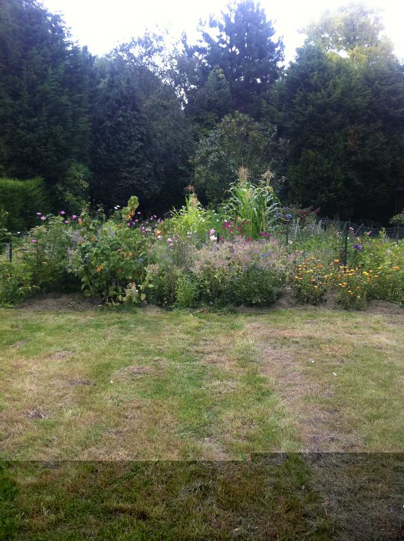 Ici voici une vue du jardin par devant, les 2 bassins se trouvent juste derrière, là c'était l'été 2011, je mélange les fleurs et les légumes afin d'avoir un max de bestiole en tout genre!