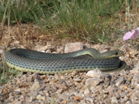 Jour 5, le 25 mai: nous quittons Pag à l'aube, prenons l'ancienne route de Zagreb qui traverse la Prezid pass, et trouvons malheureusement une très belle Malpolon insignitus fraîchement écrasée sur la route; elle parait encore vivante, ce qui est bien pour la séance photo. Une heure plus tard, en nous arrêtant sur un spot à Lacerta viridis, je découvre une immense couleuvre d'Esculape, Zamenis longissimus d'environ