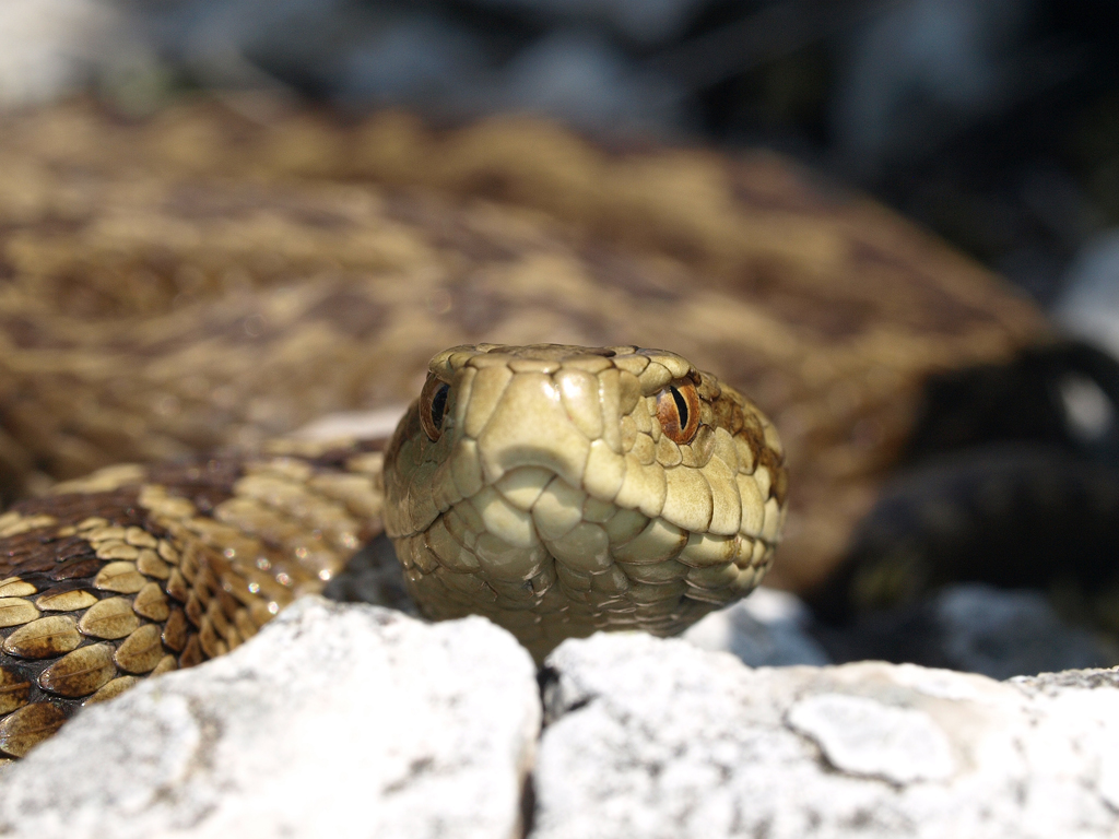 repéré un bout du corps d'une belle vipère ammmodytes dans un tas de gros cailloux. Je la saisi immédiatement (avec mes gants bien sûr) et elle me mordit prestement sous la peur plusieurs fois puis se laissa manipuler tranquillement pour