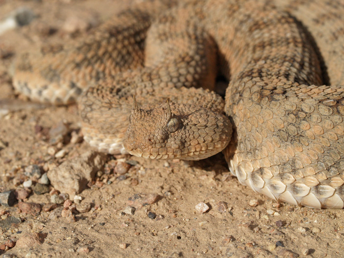 Les seules vipères à cornes, Cerastes cerastes que nous avons trouvées étaient au milieu de la route vers 22h, lorsque le vent s'était calmé et la température réchauffée.