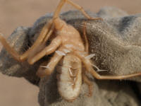 se demandant ce que ces trois hurluberlus pouvaient bricoler avec un serpent dangereux! La solifuge est assez rapide mais se calme vite sous le soleil: nous l'examinons avec des gants de soudeurs (coefficient de pénétration 3) et nous sentons le pincement fort de ses