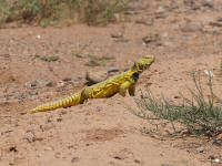 attends: un magnifique Uromastyx jaune vif sur un tas de cailloux (dans le coin il y a partout des tas de cailloux qui servent à délimiter les propriétés); nous nous précipitons Frank et moi et ne tardons pas