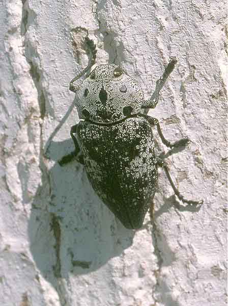 | Gros coléoptère surpris dans son sommeil diurne, sur un pilier d'un restaurant près du pont d'Aspendos. Capnodis tenebrionis, bupreste du pêcher, de la famille des Buprestidae. La larve se développe dans les racines d'arbres fruitiers à noyaux. L'espèce est répandue depuis l'Afrique du nord jusqu'au Proche-Orient en passant par l'Europe méridionale. |