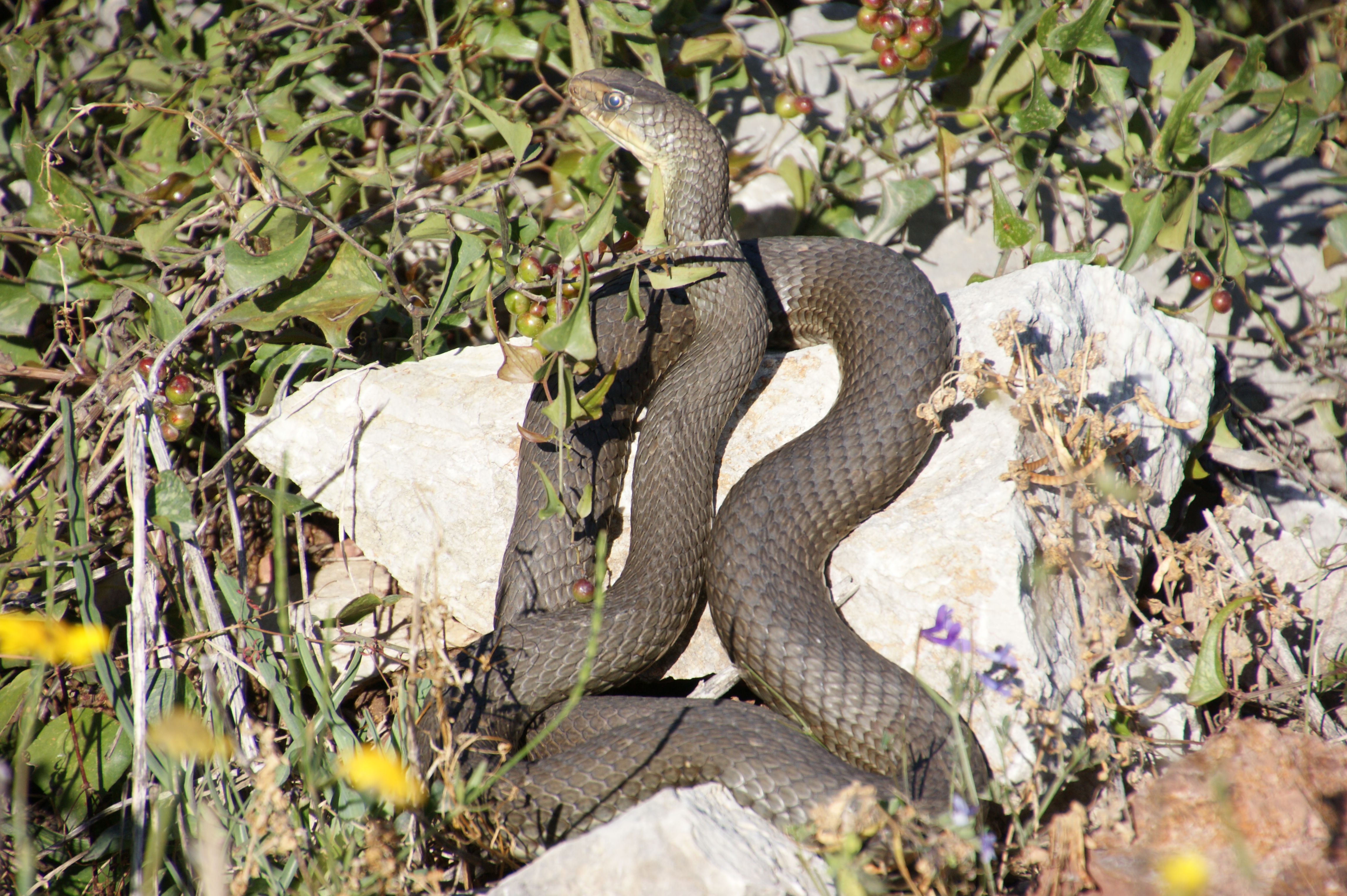 Pour une fois une photo presque convenable d'une belle couleuvre. 1m70 de biodiversité près de Koroni à 50m de la maison.